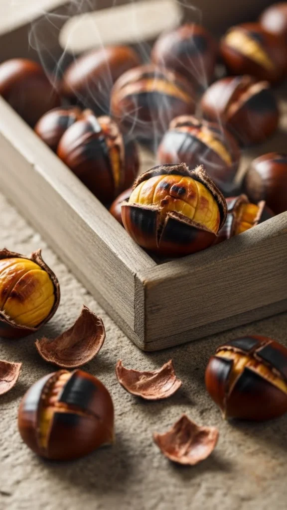 Score chestnuts, roast until tender, peel before serving. Budget-friendly: buy in bulk during winter. These warm snacks are nostalgic and festive.