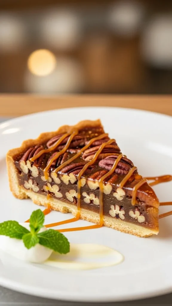 Prepare tart shell, fill with caramel and pecans, bake. Budget-friendly: use simple sugar and nuts. This dessert is sweet, crunchy, and festive.