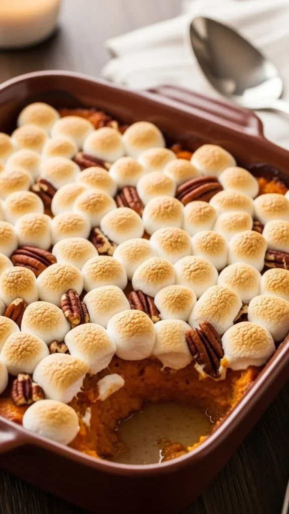 Mash sweet potatoes, mix with butter and sugar, top with marshmallows or pecans, and bake. Budget-friendly: use canned sweet potatoes or fresh, affordable ones. This holiday classic is sweet, creamy, and visually inviting.