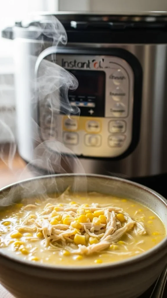 Corn adds sweetness and body. Chicken cooks quickly under pressure. Use corn flour or blended corn for thickness. This soup works well on cold nights. Store leftovers in the fridge.