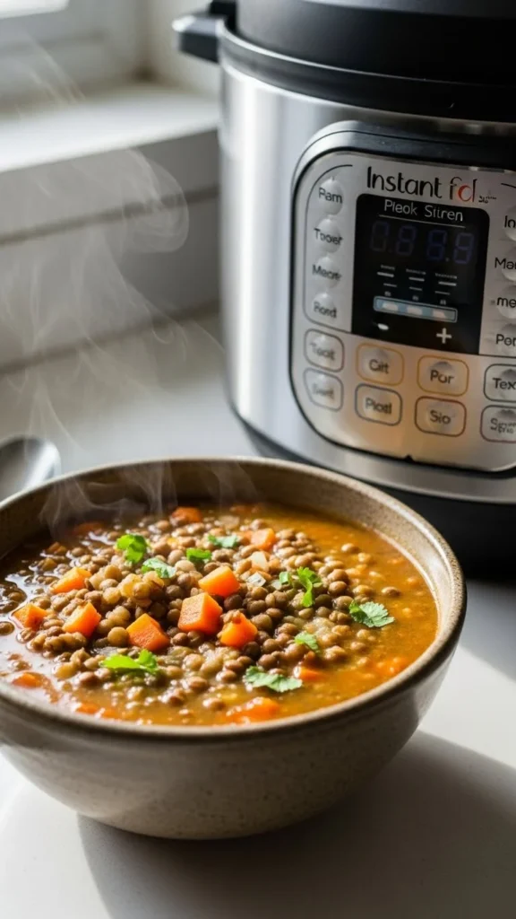 Lentils cook fast and cost little. This soup fits cold evenings and tight grocery lists. Use dried lentils. No soaking required. Onion, garlic, and carrots create a solid base. Canned tomatoes add body and flavor. Water or stock both work. Pressure cooking softens everything evenly. Season with cumin or paprika if available. If not, salt and black pepper still do the job. This soup freezes well. Make a large batch and save portions. Serve with plain bread or leftover rice. If lentils thicken too much, add hot water and stir. For added protein, crack an egg into a hot bowl and stir quickly. This keeps the meal filling without extra cost. Lentil soup proves that simple food can feel comforting and complete.