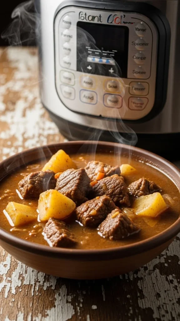 Tough beef cuts work best here. Pressure cooking makes them tender. Potatoes soak up flavor and stretch the meal. Use onion and garlic for depth. No fancy steps required. Brown the beef if you have time. If not, skip it and still get good results. This stew tastes even better the next day. Store in the fridge and reheat slowly. Serve with flatbread or plain rice. To save money, add more potatoes and fewer beef pieces. You still get a rich bowl. A spoon of flour mixed with water thickens the broth if needed. This stew works well for family dinners when everyone wants something warm and filling.