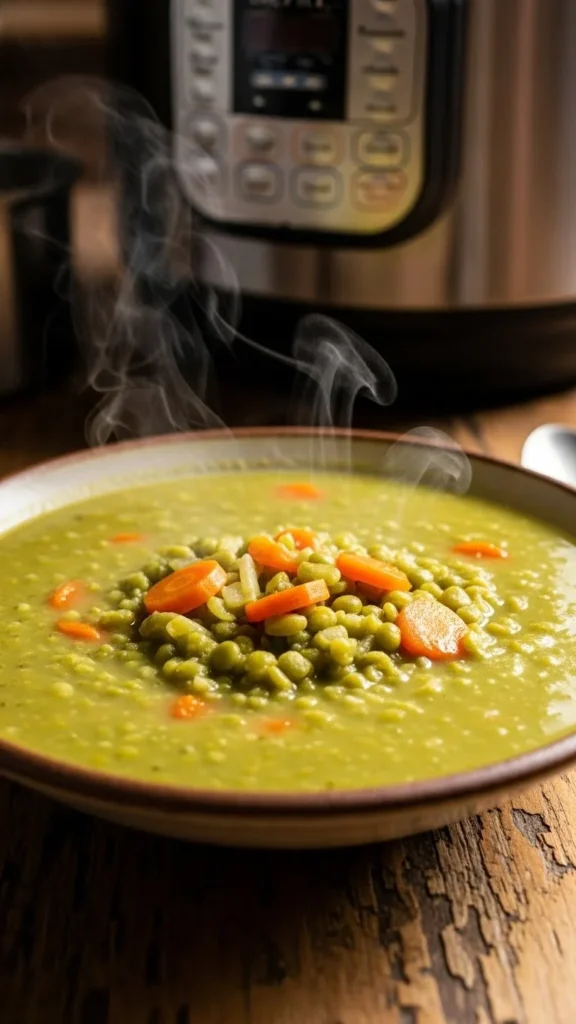 Split peas break down nicely under pressure. No soaking required. Onion and carrots add sweetness. A small piece of smoked meat adds depth, but it’s optional. Without meat, the soup still works. Cook until thick. Stir well before serving. This soup costs very little per serving. Store leftovers in the fridge for up to three days. Add water while reheating if needed. Serve with simple bread. This is a practical winter meal when groceries run low.