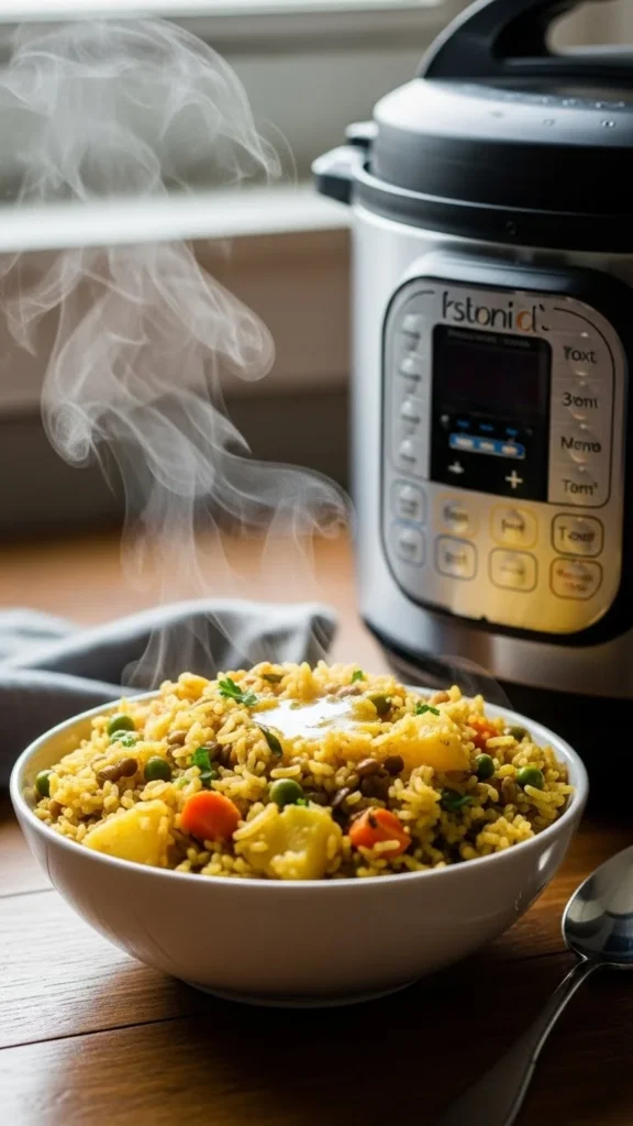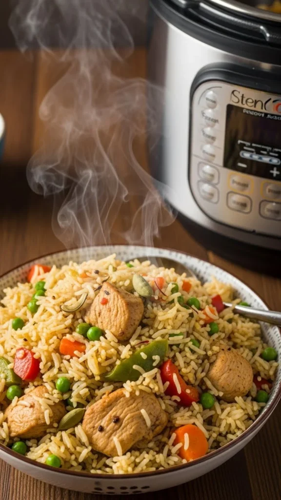 Pulao cooks evenly in the Instant Pot. Use small chicken pieces to save time. Frozen vegetables work fine. Measure water carefully to avoid soggy rice. This dish replaces takeout on busy nights. Leftovers reheat well. Add yogurt on the side if available.