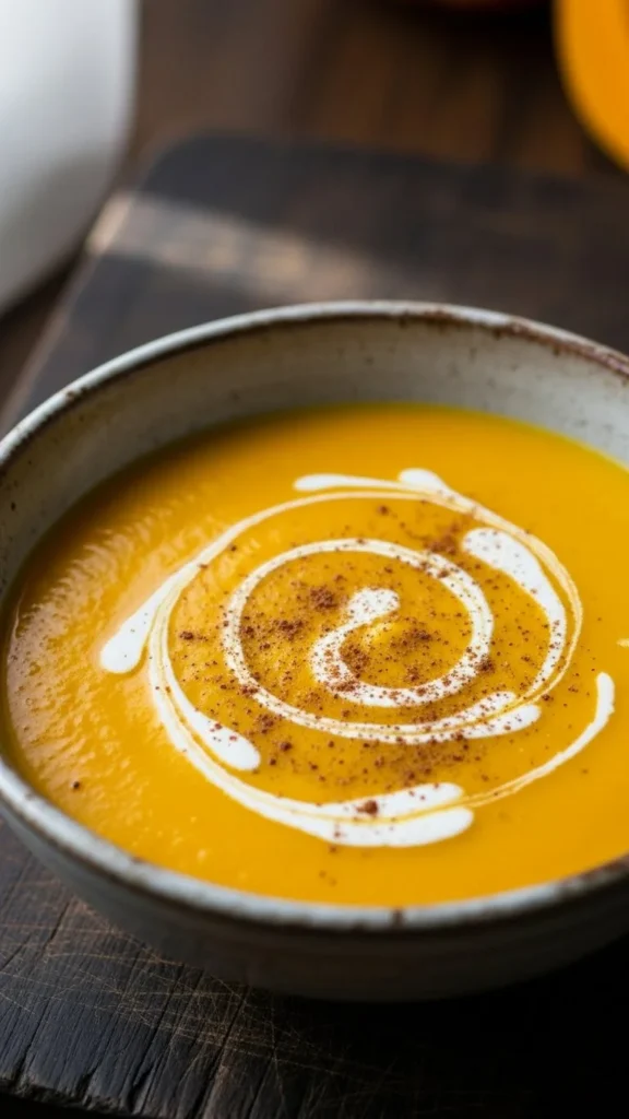 Use canned pumpkin and cream to create a silky soup without carbs from potatoes. Add garlic, paprika, and a bit of cinnamon for warmth.