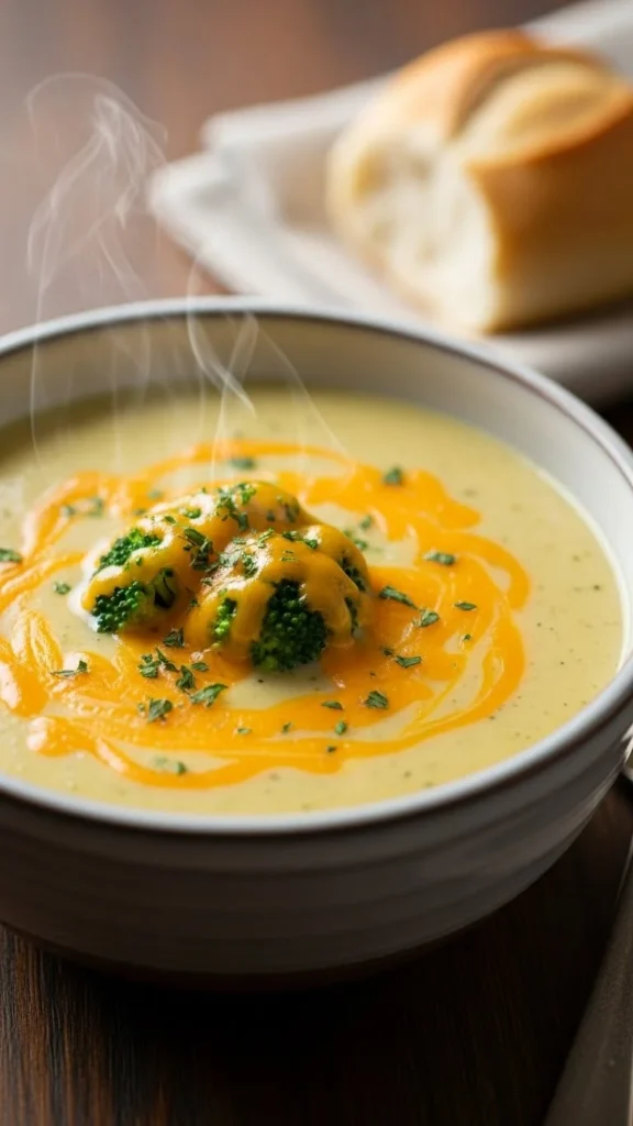 This soup turns broccoli into a smooth, cheese-forward bowl that many kids accept. Steam broccoli, blend it with broth, butter, and cheese until creamy.