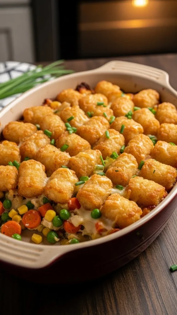 Tater tot bake hides vegetables inside a creamy filling. Mix cooked chicken or mince with peas, carrots, and corn in a simple sauce. Top with tater tots and bake.