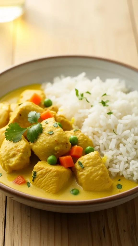 This curry keeps flavours gentle while offering something different. Cook chicken with onion, garlic, and a mild curry powder. Add coconut milk for creaminess.
