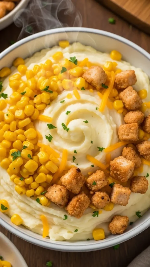 Mashed potato bowls give kids soft, predictable textures they usually accept. Make smooth potatoes, then top with corn, shredded chicken, or cheese.