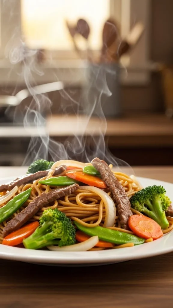 Thin beef slices cook fast. Use soy sauce and garlic for flavor. Noodles soak up sauce well. Add cabbage to stretch servings. This stir-fry works with leftovers and reheats smoothly.