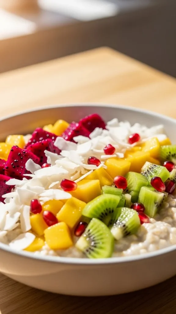 Tropical coconut oatmeal is fruity, sweet, and warming. Fold shredded coconut and diced fruits like mango or pineapple into cooked oats. Coconut adds texture and flavor. Frozen fruits make this recipe affordable. Sweeten lightly with honey. This oatmeal keeps you full and brings a tropical twist to winter mornings. Optional toppings include nuts or seeds. Quick, practical, and satisfying.