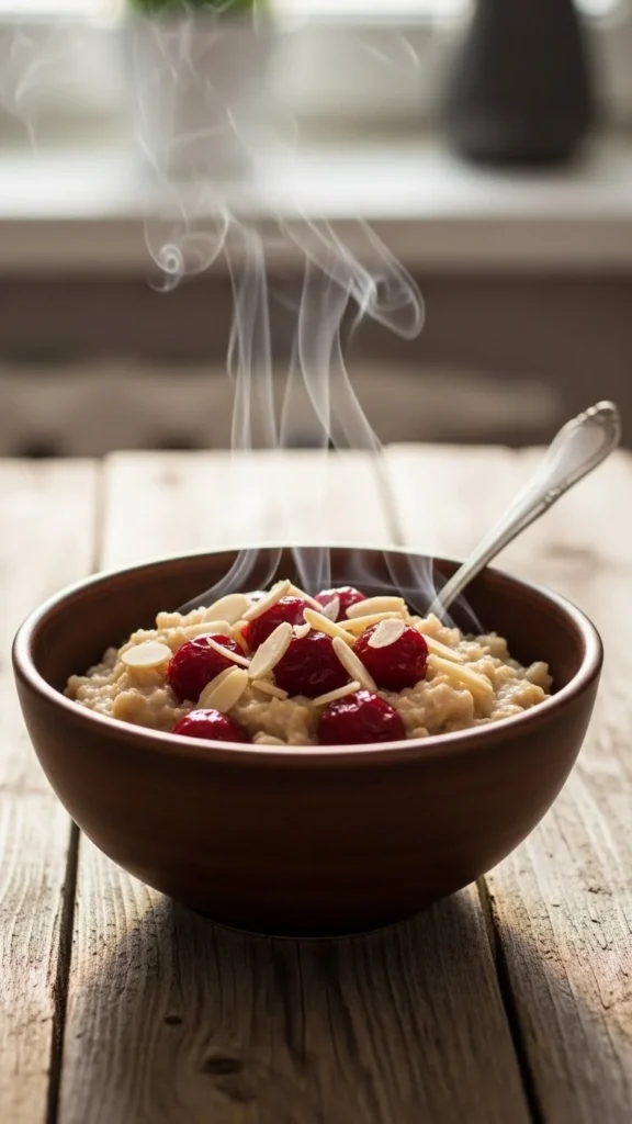 Cherry almond oatmeal is tart, sweet, and nutty. Add fresh or frozen cherries and sliced almonds to hot oats. Sweeten lightly with honey. Frozen cherries make this budget-friendly. Almonds add texture and protein. This oatmeal is filling and perfect for winter mornings. Optional toppings include cinnamon or seeds. Quick to make and satisfying.