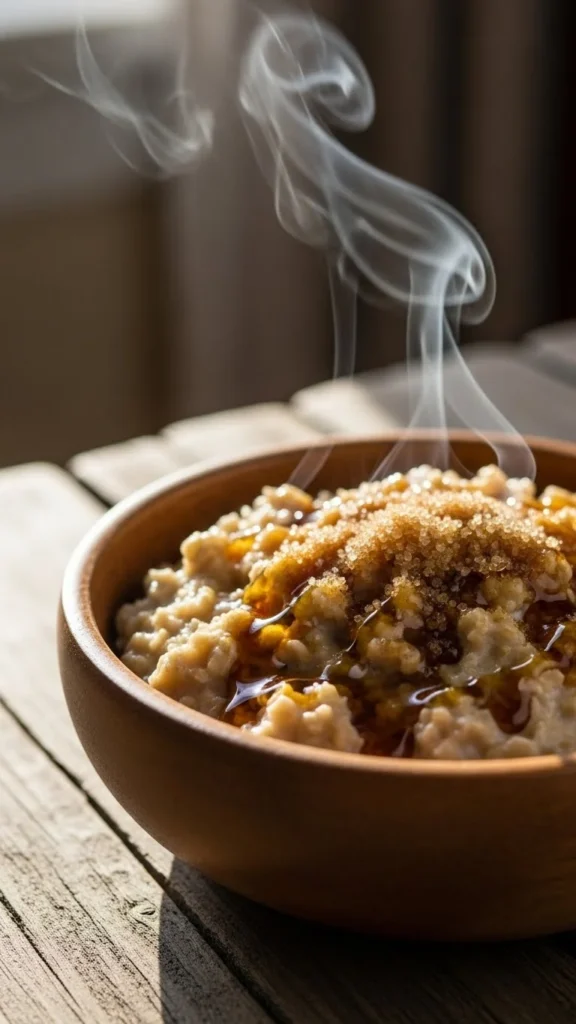Maple brown sugar oatmeal is sweet, warming, and simple. Stir brown sugar and a drizzle of maple syrup into hot oats. Sweeten to taste. Optional toppings include nuts, seeds, or fruit. This oatmeal is practical, filling, and budget-friendly. The aroma of maple and brown sugar makes winter mornings cozy. Quick to prepare and perfect for a satisfying breakfast.