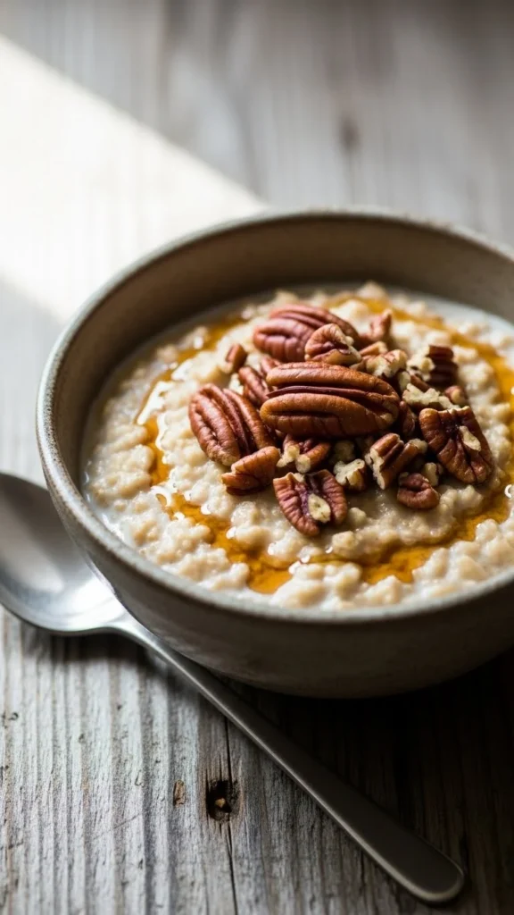 Maple pecan oatmeal is sweet, nutty, and hearty. Stir chopped pecans and a drizzle of maple syrup into hot oats. Toasting the pecans beforehand enhances flavor. Maple syrup adds natural sweetness. Pecans can be bought in bulk to keep costs low. This oatmeal is satisfying, warming, and filling. Perfect for winter mornings when you want a simple yet indulgent breakfast. Serve with milk or yogurt.