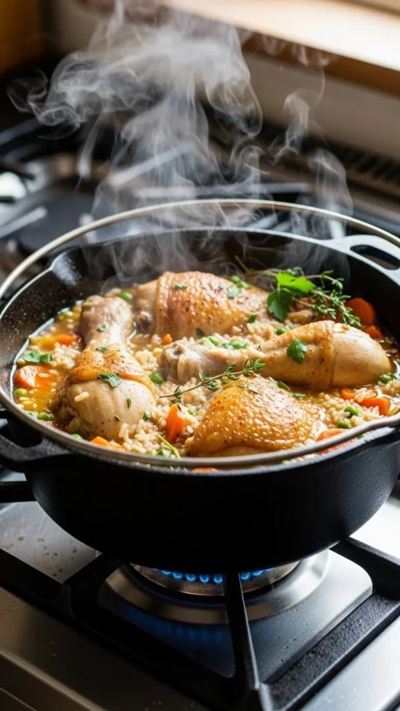 This meal works because everything cooks at the same pace. Start with small chicken pieces. Brown them lightly with oil, salt, and pepper. Remove them briefly. Add rice and water or broth to the same pot. Stir well.