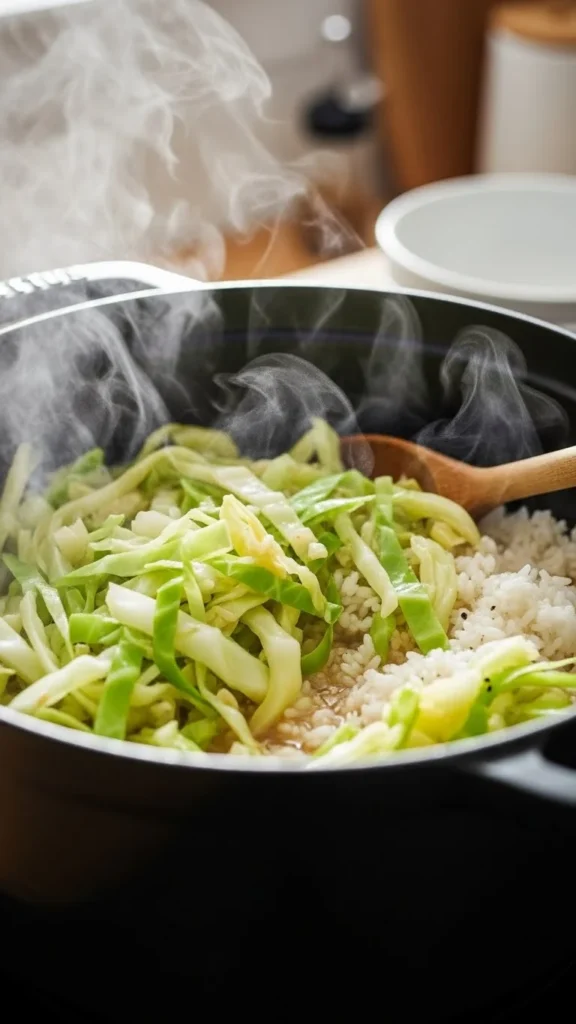 Cabbage softens as rice cooks.