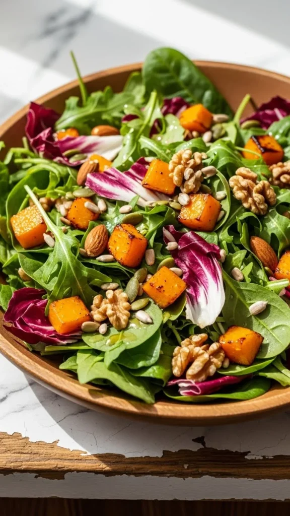Roasted pumpkin salad is hearty and seasonal. Roast pumpkin cubes with olive oil, salt, and pepper. Toss with salad greens, nuts, seeds, and vinaigrette. Budget-friendly: use seasonal produce. Serve as lunch or a side. The warm roasted pumpkin adds sweetness and texture to the salad.