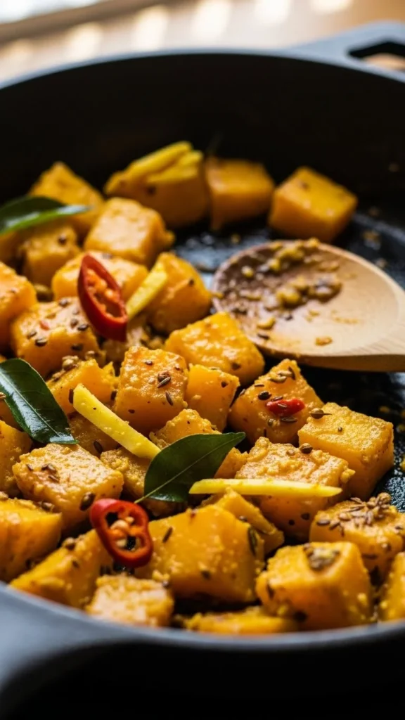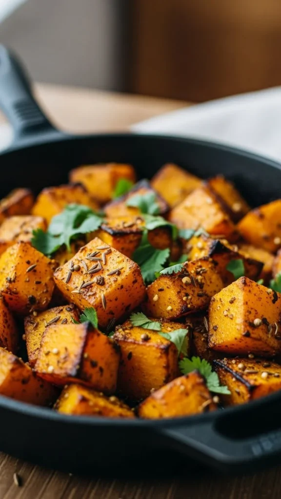 Roasted cinnamon pumpkin is simple and warming. Cube the pumpkin, toss with olive oil, cinnamon, salt, and a pinch of sugar. Roast at 400°F for 25–30 minutes until tender and slightly caramelized. Budget tip: buy a whole pumpkin and prep yourself. This dish works as a side, a salad topping, or a cozy snack. Roasting brings out the natural sweetness, creating a rich, comforting flavor.