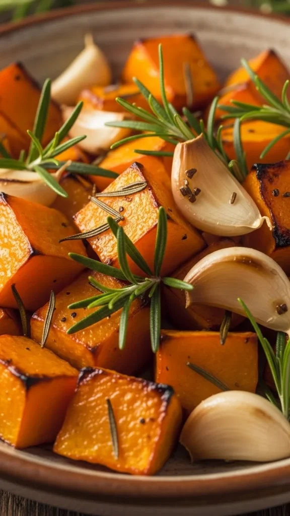 Garlic herb pumpkin is savory and aromatic. Cube pumpkin, toss with olive oil, minced garlic, rosemary, salt, and pepper. Roast at 400°F until tender, about 25 minutes. Budget tip: use dried herbs if fresh are unavailable. Serve as a side or add to pasta or salad bowls. The herbs and garlic bring depth to naturally sweet pumpkin.