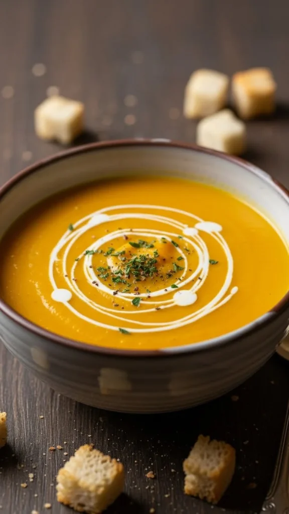 Pumpkin soup is creamy, hearty, and comforting. Roast pumpkin cubes, then blend with broth, a splash of cream, and seasonings. Budget-friendly: make large batches and freeze portions for later. Serve with bread or crackers for a warming meal. Roasting the pumpkin beforehand enhances sweetness and gives a natural richness to the soup.