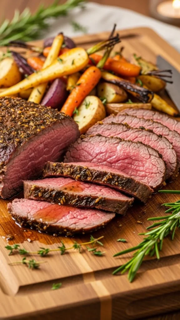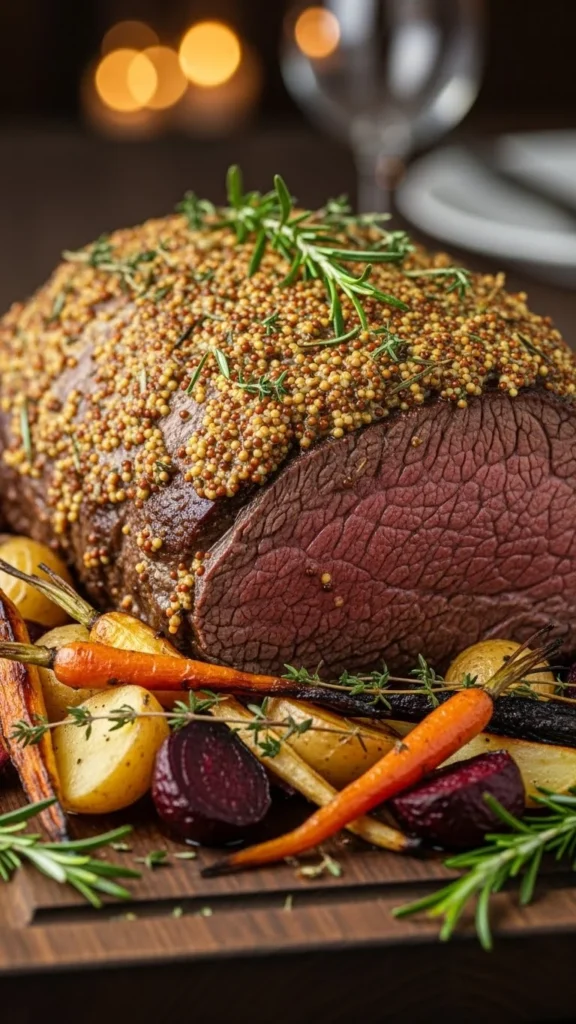 Season beef with rosemary, thyme, garlic, and olive oil. Roast slowly for a tender result. Budget-friendly tip: choose affordable cuts like chuck or top round. Serve with roasted carrots and potatoes for a warm, satisfying winter meal.