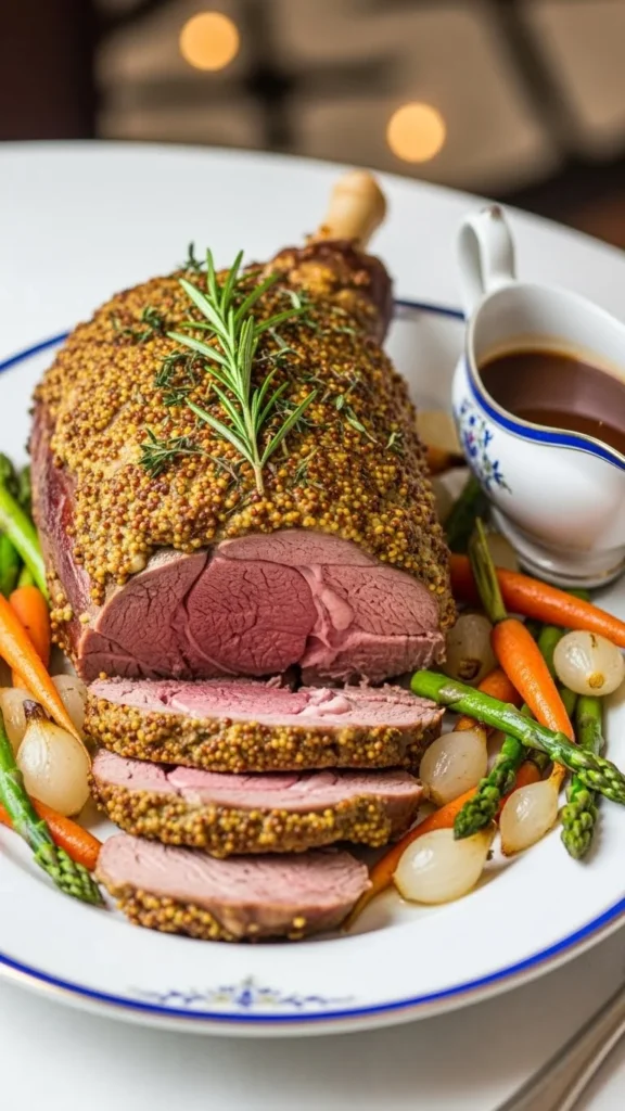 Coat lamb in Dijon mustard and herbs, roast until golden. Budget-friendly: buy frozen leg or shank for savings. This tangy and fragrant roast is a crowd-pleaser.