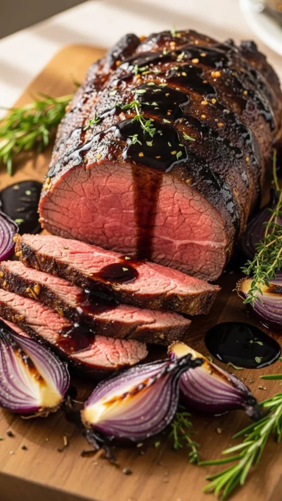 Combine balsamic vinegar and honey, brush over beef, and roast. Budget-friendly: use economical cuts for slow roasting. This glaze creates a savory-sweet aroma.