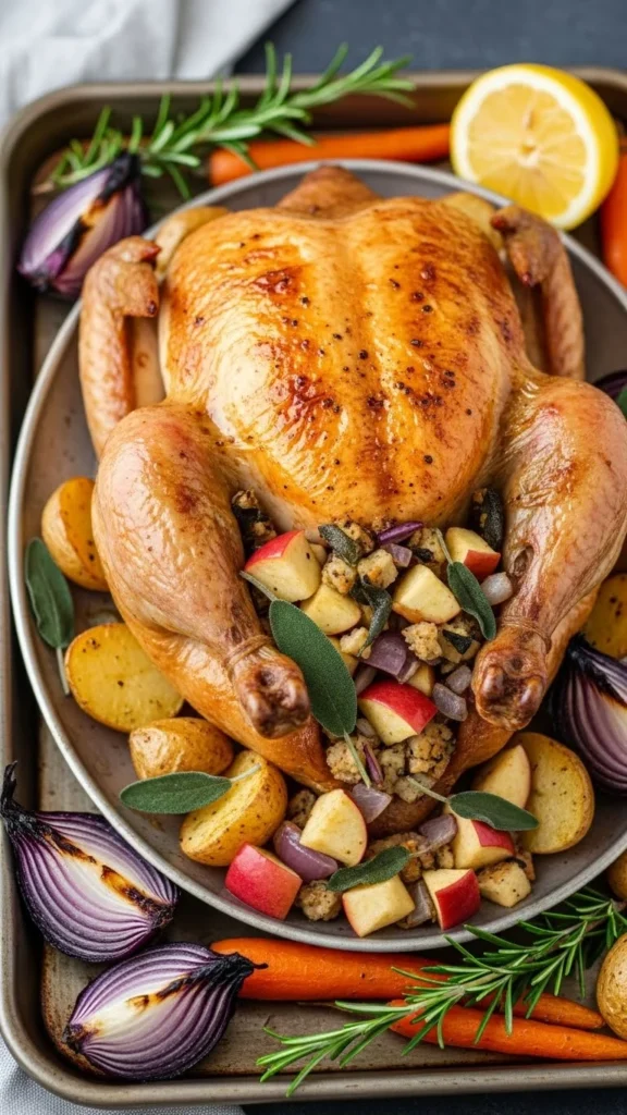 Stuff chicken with apples and sage. Roast until golden and fragrant. Budget-friendly: use in-season apples. This roast balances sweetness with herbaceous aroma.