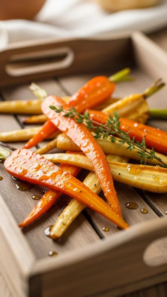Toss vegetables with honey and olive oil, roast until caramelized. Budget-friendly: in-season veggies keep costs low. This sweet roast complements meats perfectly.