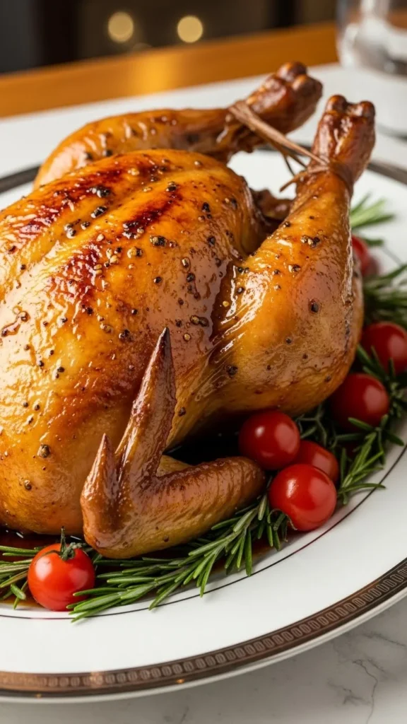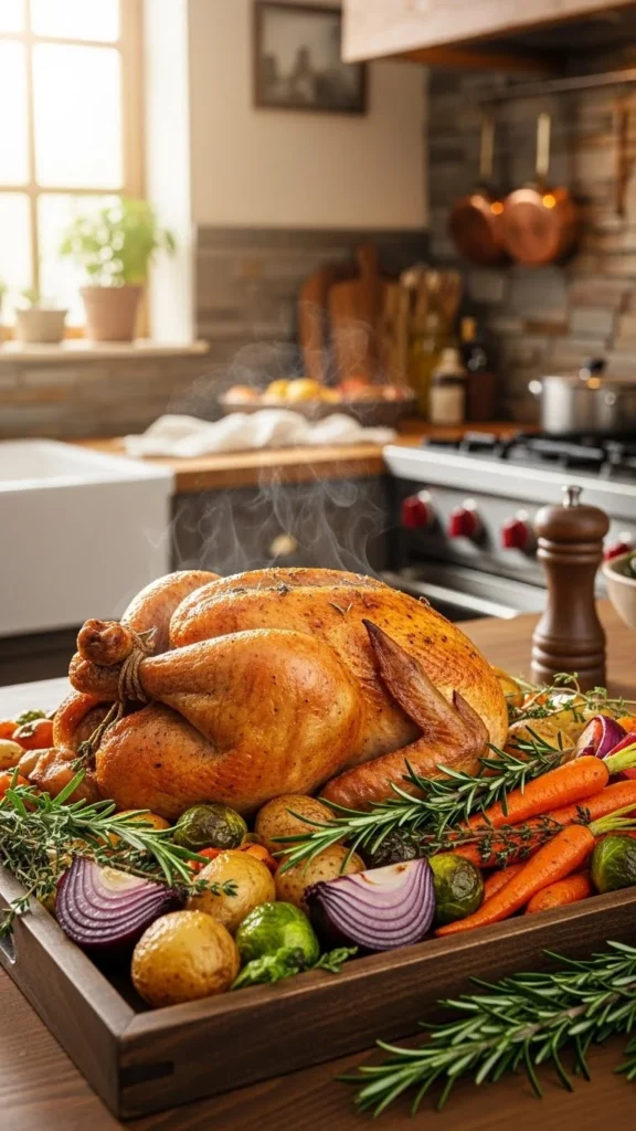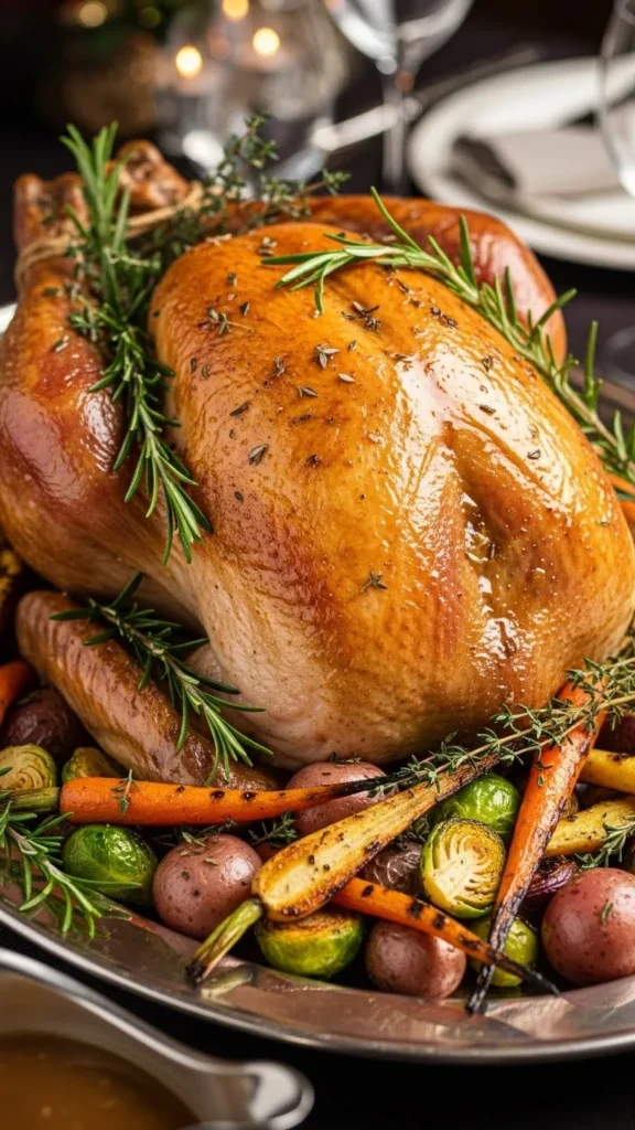 Rub turkey with garlic, rosemary, and thyme. Roast until golden. Budget-friendly: buy smaller birds or frozen options. This classic roast is aromatic and festive.