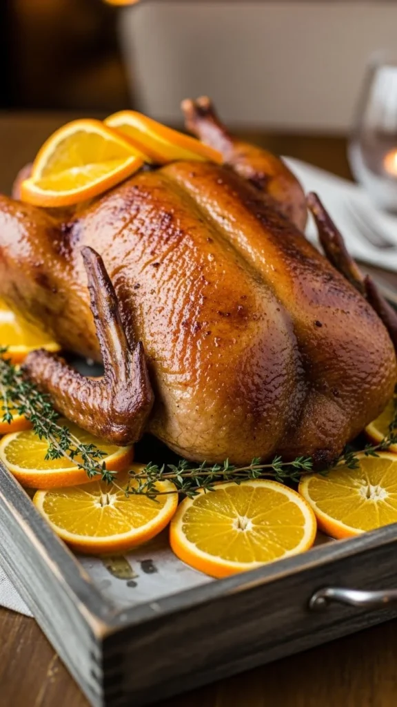 Stuff duck with oranges and thyme. Roast slowly to crisp skin. Budget-friendly: buy smaller ducks for easier cooking. This citrus-infused roast is both aromatic and elegant
