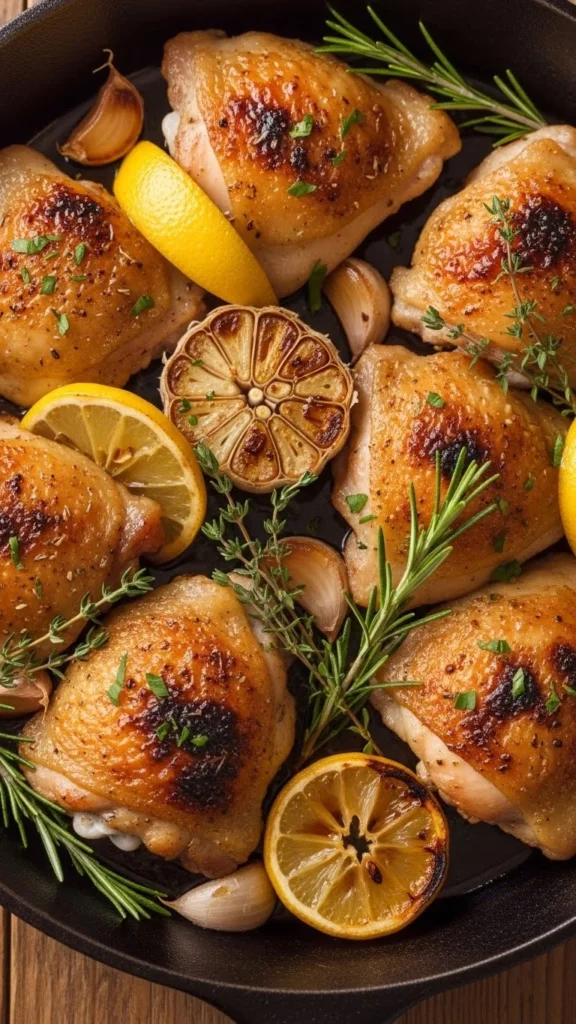 Marinate chicken thighs in lemon juice, garlic, and herbs. Roast until golden. Budget-friendly: thighs are cheaper than whole chickens. This zesty roast is quick, easy, and flavorful.