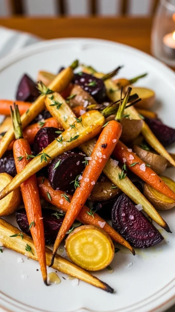 Maple roasted root vegetables are sweet, earthy, and simple. Toss with olive oil, maple syrup, salt, and pepper. Roast until tender. Budget-friendly: buy seasonal vegetables. Serve as a side or in salads. Maple syrup enhances natural sweetness.