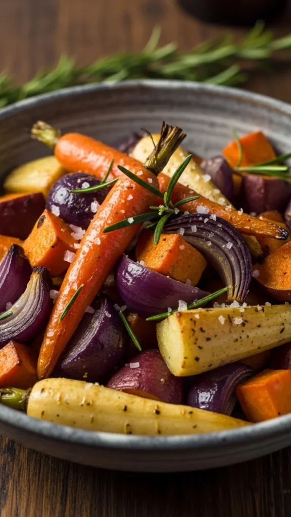 Rosemary roasted winter vegetables are earthy, fragrant, and simple. Toss vegetables with olive oil, fresh rosemary, salt, and pepper. Roast until caramelized. Budget-friendly: use seasonal produce. Serve as a side or in salads. The rosemary adds aroma and depth.