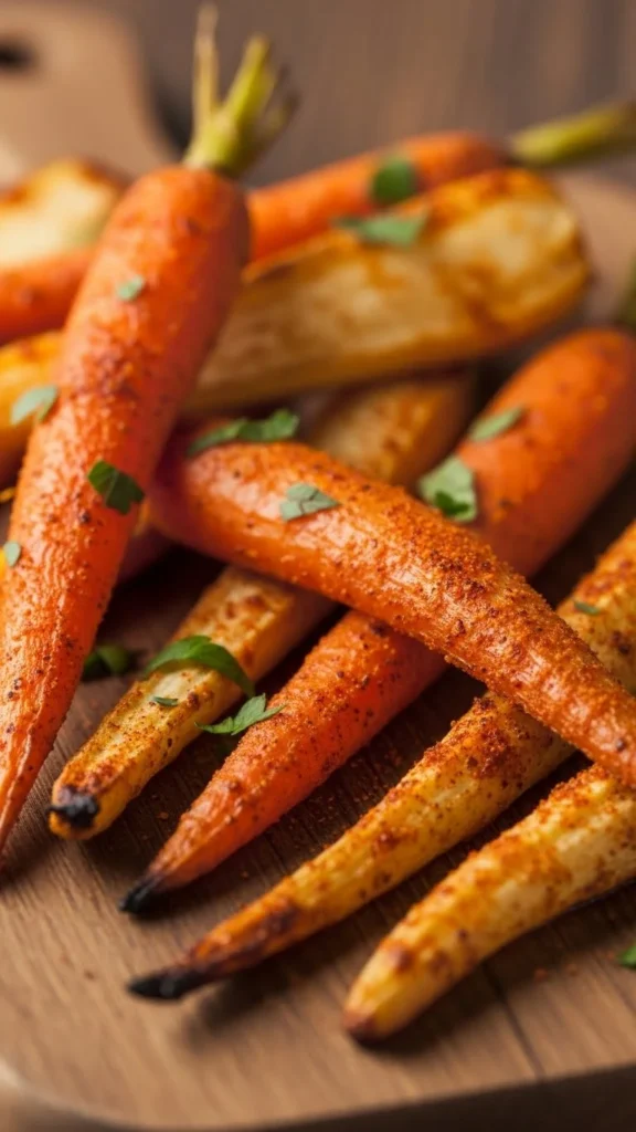 Spicy roasted carrot and parsnip sticks are sweet, earthy, and warming. Toss with olive oil, paprika, chili flakes, salt, and pepper. Roast at 400°F until caramelized. Budget-friendly: use seasonal roots. Serve as a side dish or add to bowls. Spices enhance the natural flavors.