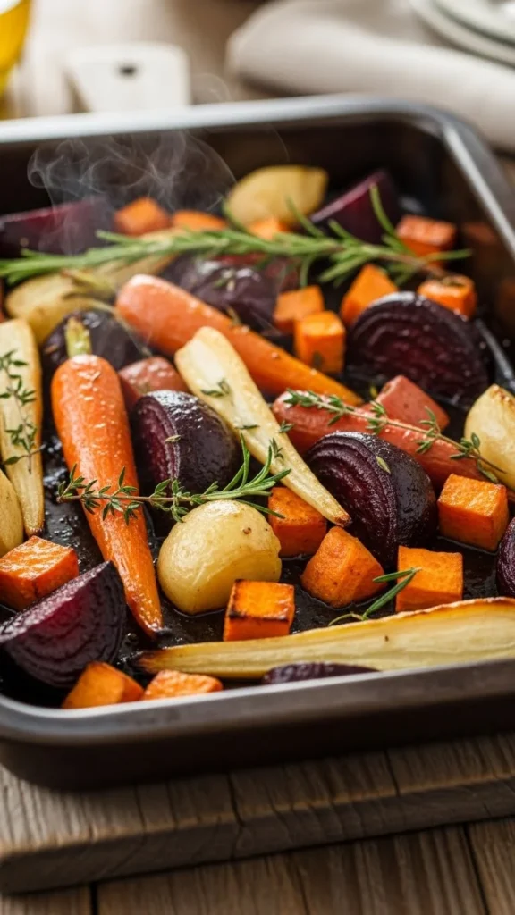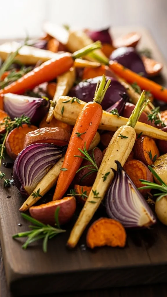 Garlic and thyme roasted root vegetables are fragrant and savory. Toss chopped vegetables with olive oil, garlic, thyme, salt, and pepper. Roast at 400°F until caramelized. Budget-friendly: buy in-season vegetables. Serve as a side dish or mixed into grains. The garlic and herbs enhance earthy flavors.