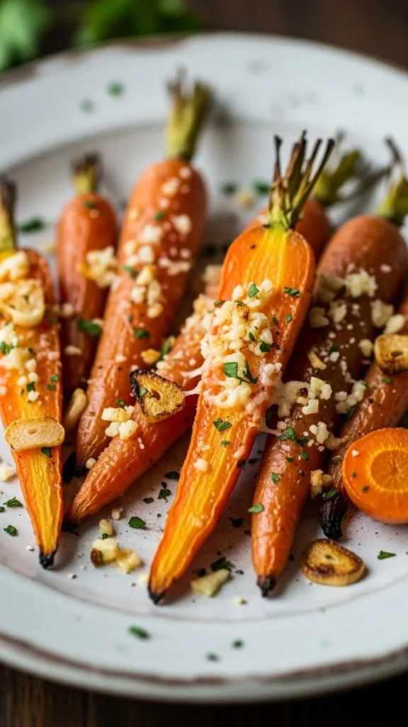 Garlic Parmesan roasted carrots are savory, sweet, and easy. Toss carrots with olive oil, garlic, salt, pepper, and sprinkle parmesan halfway through roasting. Budget-friendly: use store-brand parmesan. Serve as a side dish. Roasting adds caramelization while garlic and cheese boost flavor.