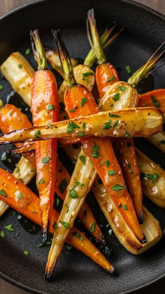 Honey mustard roasted carrots and parsnips are sweet, tangy, and earthy. Toss sticks with olive oil, honey, mustard, salt, and pepper. Roast at 400°F until caramelized. Budget-friendly: use in-season vegetables. Serve as a side or in winter bowls. The glaze enhances natural sweetness.