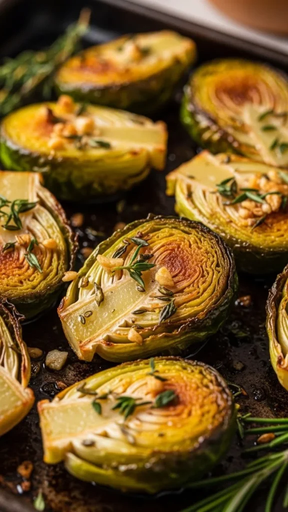 Roasted Brussels sprouts with garlic and herbs are savory and easy. Halve sprouts, toss with olive oil, minced garlic, thyme, salt, and pepper. Roast at 425°F for 20 minutes. Budget-friendly: buy in-season sprouts. Serve as a side or toss with pasta for a warm winter dish. The roasting process brings out natural sweetness and crunch.