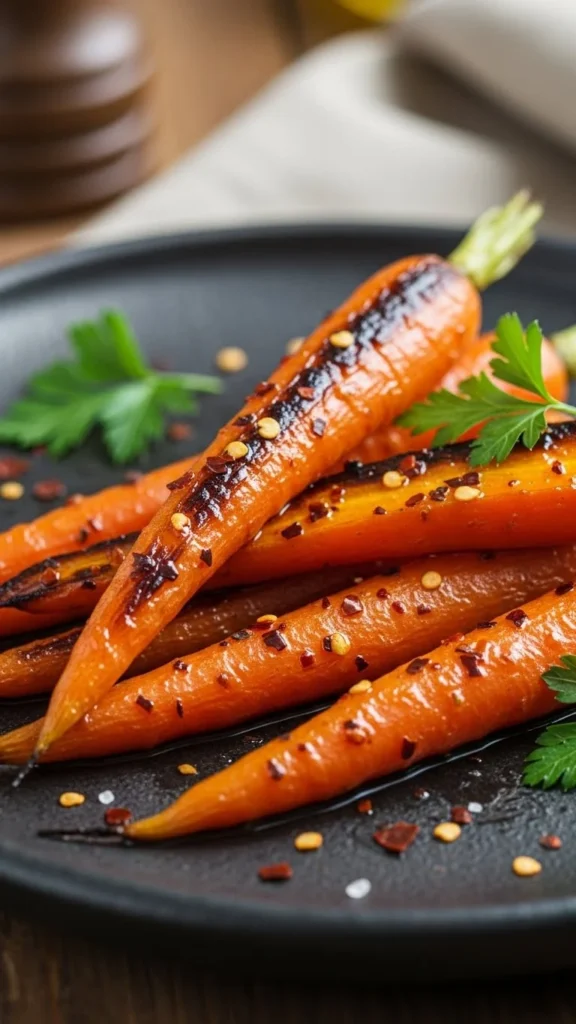 Chili roasted carrots are spicy, sweet, and simple. Slice carrots, toss with olive oil, chili flakes, salt, and pepper. Roast at 400°F for 20 minutes. Budget-friendly: buy carrots in bulk. Serve as a side dish or add to grain bowls. The chili adds warmth while roasting enhances natural sweetness.