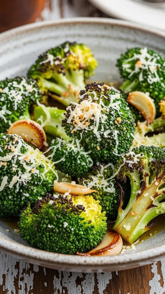 Garlic Parmesan roasted broccoli is earthy, cheesy, and quick. Toss florets with olive oil, garlic, salt, pepper, and sprinkle parmesan halfway through roasting. Roast at 425°F for 20 minutes. Budget-friendly: use store-brand parmesan. Serve with pasta or as a side. Roasting gives broccoli a nutty, crispy texture.