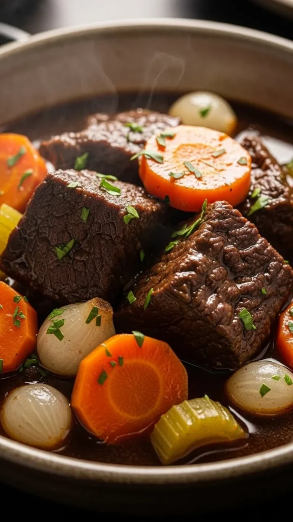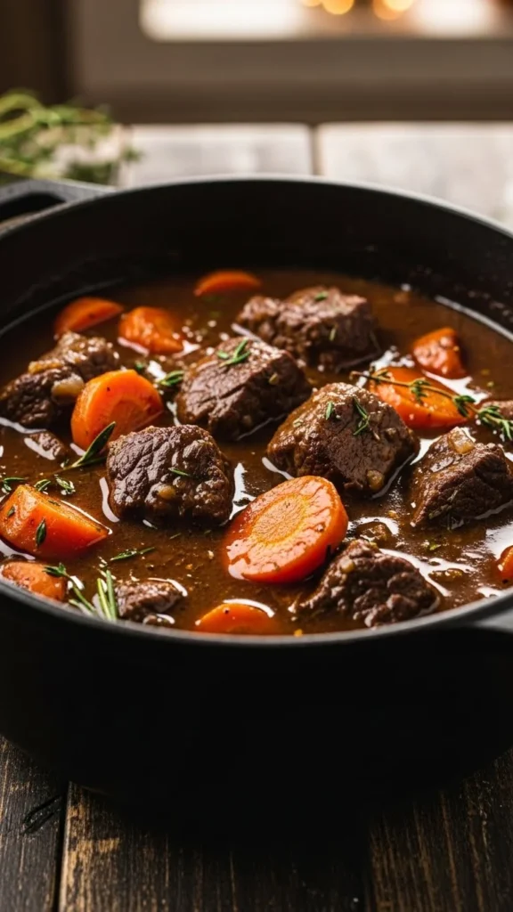 Beef carrot stew is simple and hearty. Sear beef, add carrots, onions, and broth, then slow cook. Budget-friendly: use frozen or seasonal carrots. Serve with bread or potatoes. The slow cooking softens the meat and develops deep, comforting flavors.