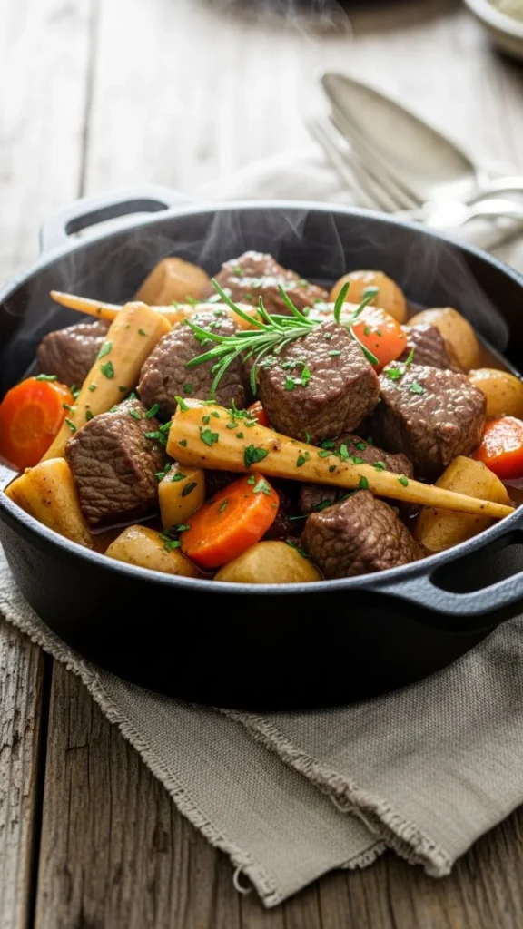 Beef parsnip stew is hearty and earthy. Brown beef, add parsnips, carrots, onions, and broth, then slow cook. Budget-friendly: use seasonal parsnips. Serve with bread. The slow cooking develops deep flavors and tender meat, ideal for winter nights.