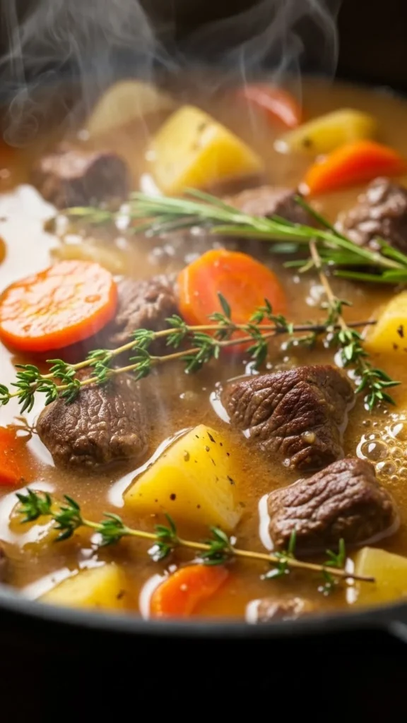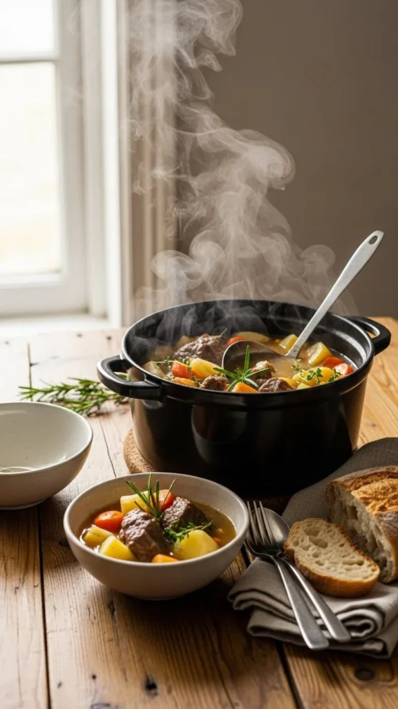 This stew works well when you want something filling without complicated prep. Use chuck roast because it becomes tender after long cooking. Keep the vegetables simple with carrots, potatoes, and celery. Cook everything low and slow until the broth thickens naturally. You can switch beef for cheaper stew meat to cut grocery costs. Add frozen vegetables instead of fresh if you’re trying to save money. This stew reheats nicely, so make a double batch and store extras in containers. If you want deeper flavor, sauté onions before adding everything else. Serve with crusty bread or spoon it over rice for extra comfort. It’s a practical dish that turns basic ingredients into something satisfying.