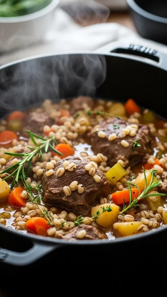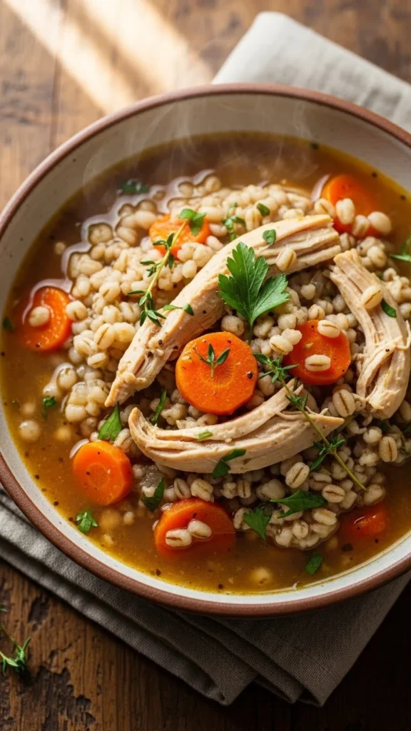 This recipe brings a soft, cozy texture thanks to barley. Use chicken thighs because they hold up better during long cooking. Add carrots, celery, and garlic for simple flavor. Barley is inexpensive, so it’s great for budget cooking. If you want a gluten-free option, swap barley for rice. Add frozen peas at the end for color. This stew becomes thicker the next day, making leftovers even better. Cook it on the stove or in a slow cooker. Add a splash of lemon right before serving for brightness. It’s an easy recipe for days when you want something warm without too much effort.