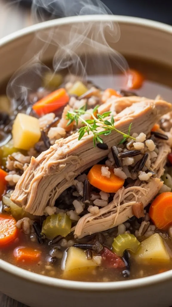 This recipe uses wild rice to create a hearty texture. If turkey is expensive, you can replace it with chicken or leftover roasted turkey. Carrots, celery, and onion add simple flavor. Wild rice expands a lot, so start with a small amount. Add broth gradually until the stew reaches your preferred thickness. Freeze leftovers for quick lunches. Add kale at the end for extra color and nutrients. A splash of cream makes it richer, but it still works without it. It’s a good way to use pantry grains while keeping meals practical.