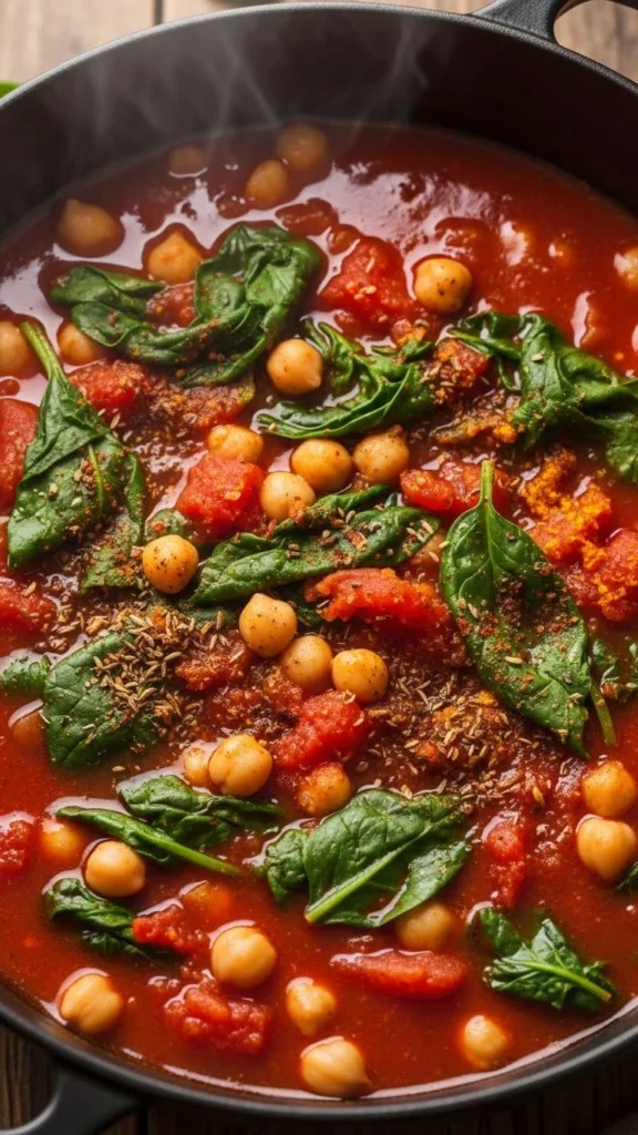 Chickpeas make this stew filling without using meat. Combine canned chickpeas with tomatoes, garlic, and spices like cumin or paprika. Add spinach right before serving so it stays bright. Chickpeas are budget-friendly and store well, making this stew perfect for quick dinners. Add diced potatoes if you want more volume. You can serve it with rice, flatbread, or roasted vegetables. Make a large batch because this stew tastes even better the next day.