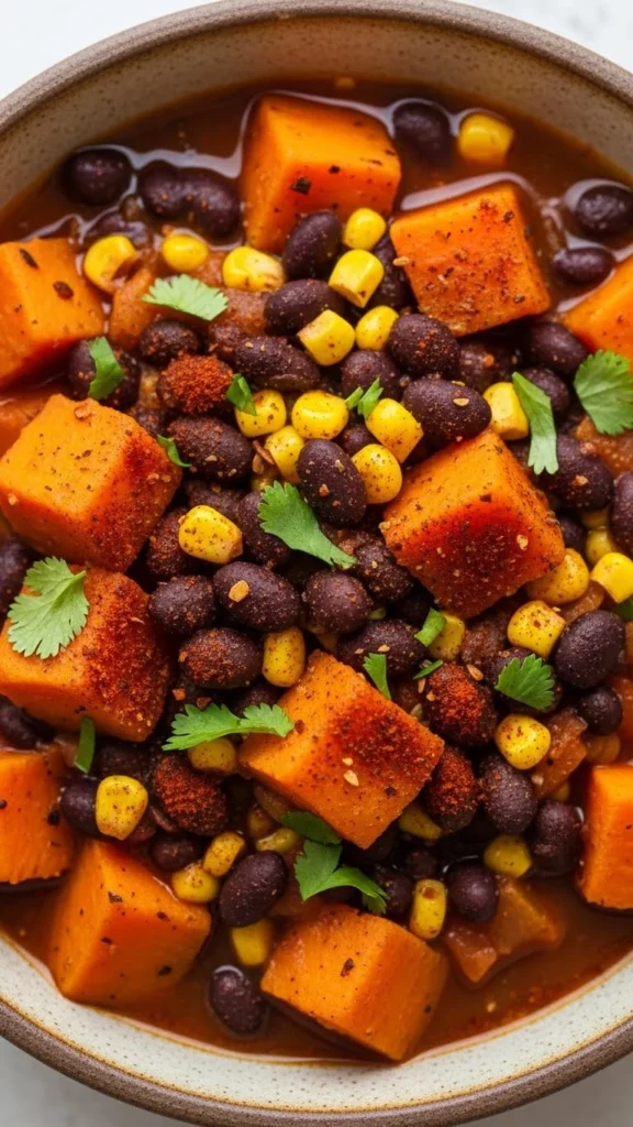 Sweet potatoes create natural thickness. Combine them with black beans, corn, and spices like chili powder. Everything cooks into a warm, hearty pot that feels filling without meat. Frozen corn works perfectly and keeps costs low. Add lime juice at the end to brighten it. Top with avocado if you want something extra. This stew stores well and makes a simple lunch option.