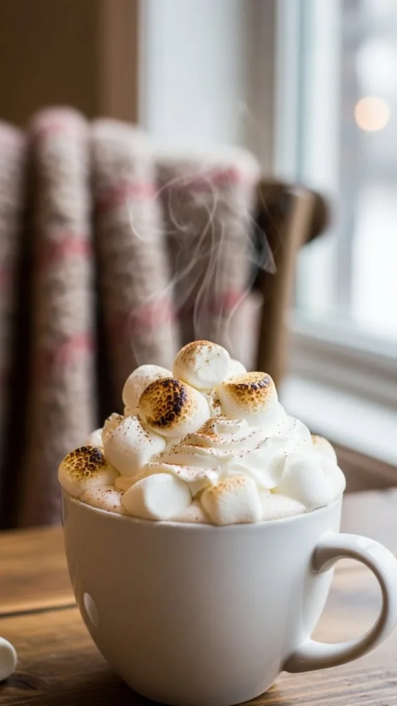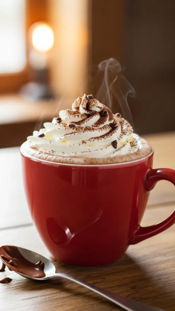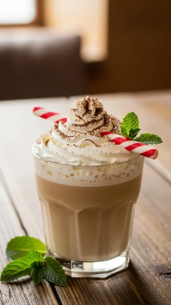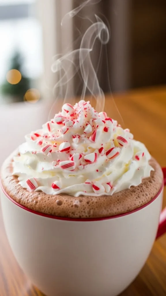 Mix cocoa, milk, and peppermint extract. Top with whipped cream and candy pieces. Budget-friendly: use store-bought candy canes. This chocolatey drink is festive and cozy.