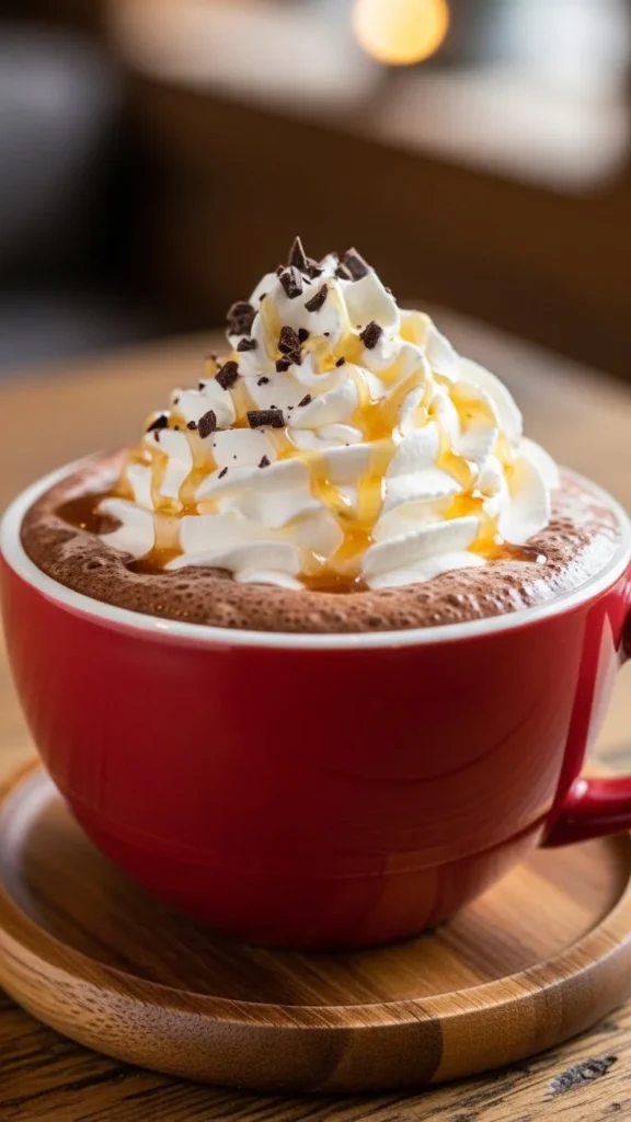 Prepare hot chocolate, stir in caramel sauce, top with whipped cream. Budget tip: make caramel at home with sugar and butter. This sweet, creamy drink is indulgent yet simple.